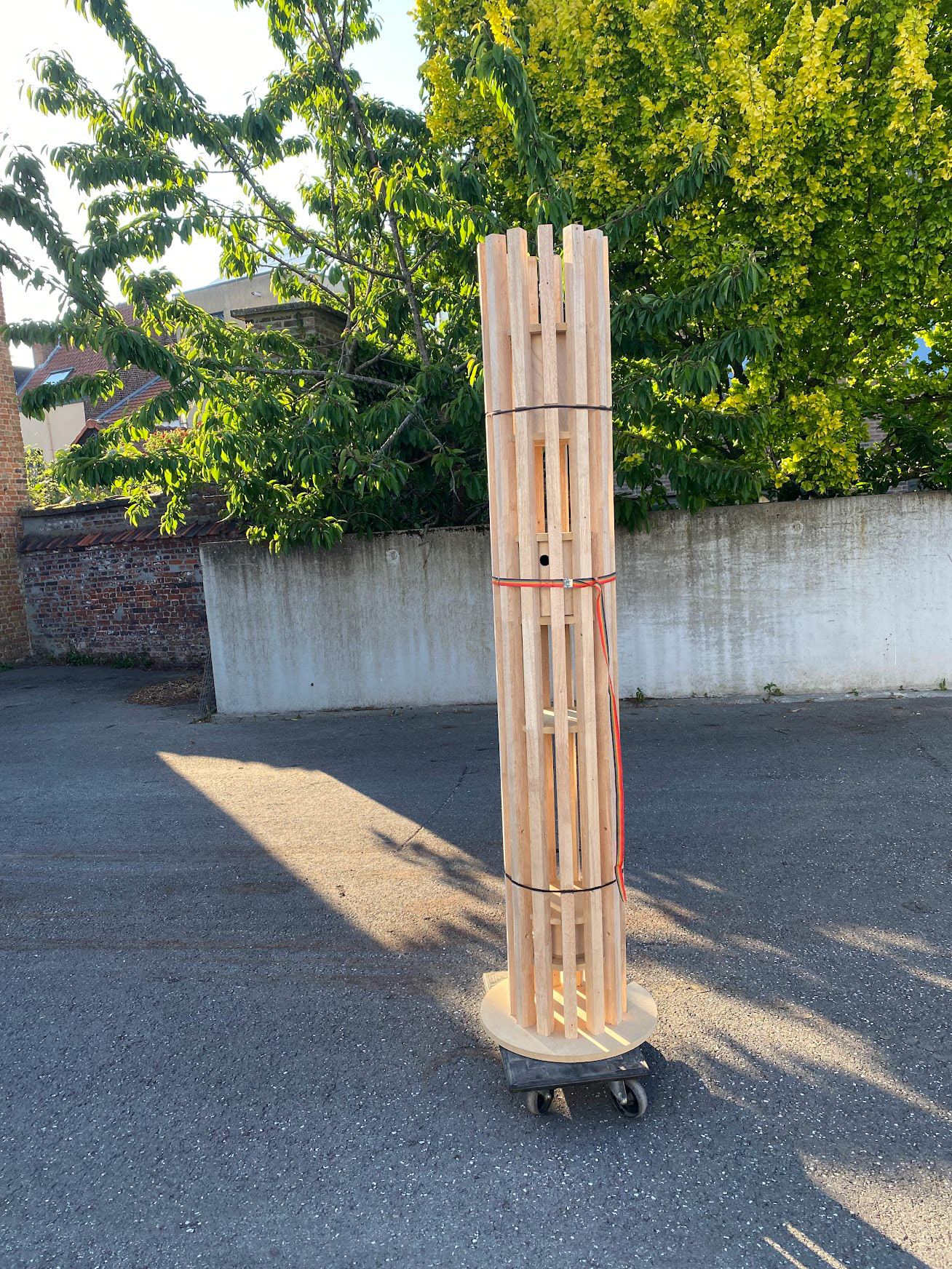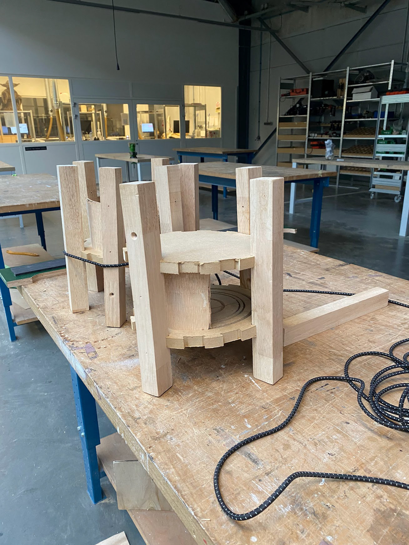 Birdtower made out of: rubberwood, cnc'd mdf, and elastic rope.